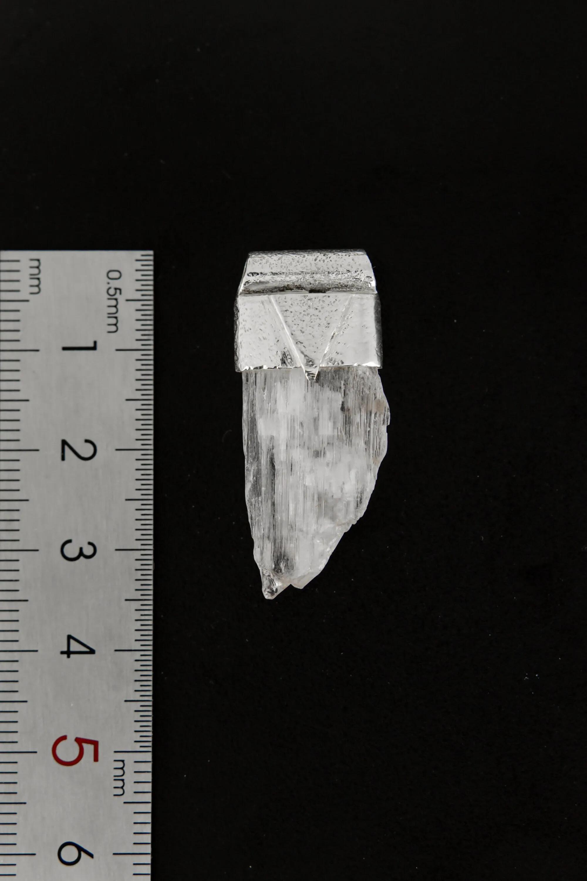 The pendant features an organically textured silver bezel, which not only secures the precious crystal but also adds an element of refined rusticity to the piece. The front of the cap is embellished with a small, iconic silver triangle, symbolizing The Stonery's commitment to quality and uniqueness. The pendant is equipped with a 3mm tubular bail, allowing for seamless integration with other pendants from the collection or striking simplicity when worn alone.