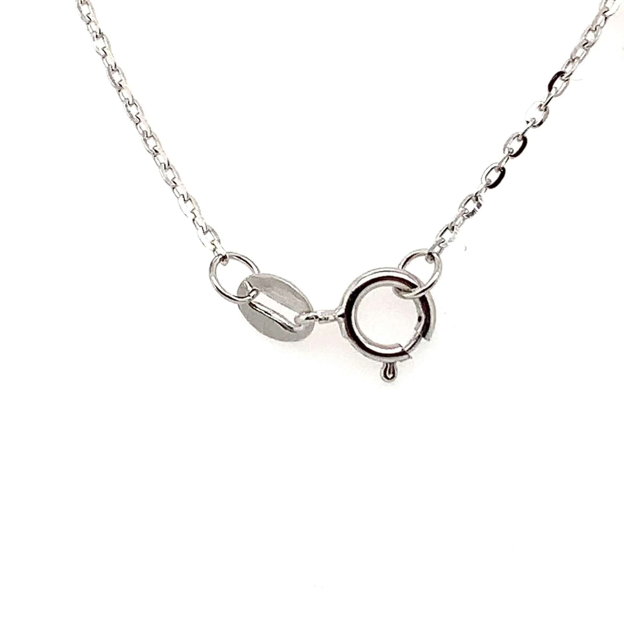 This 14K white gold necklace contains 2 sapphires weighing approximately 0.20 ctw and 21 round diamonds weighing approximately 0.06 ctw. The chain is adjustable to 18" long and the necklace weighs approximately 1.7 grams.
